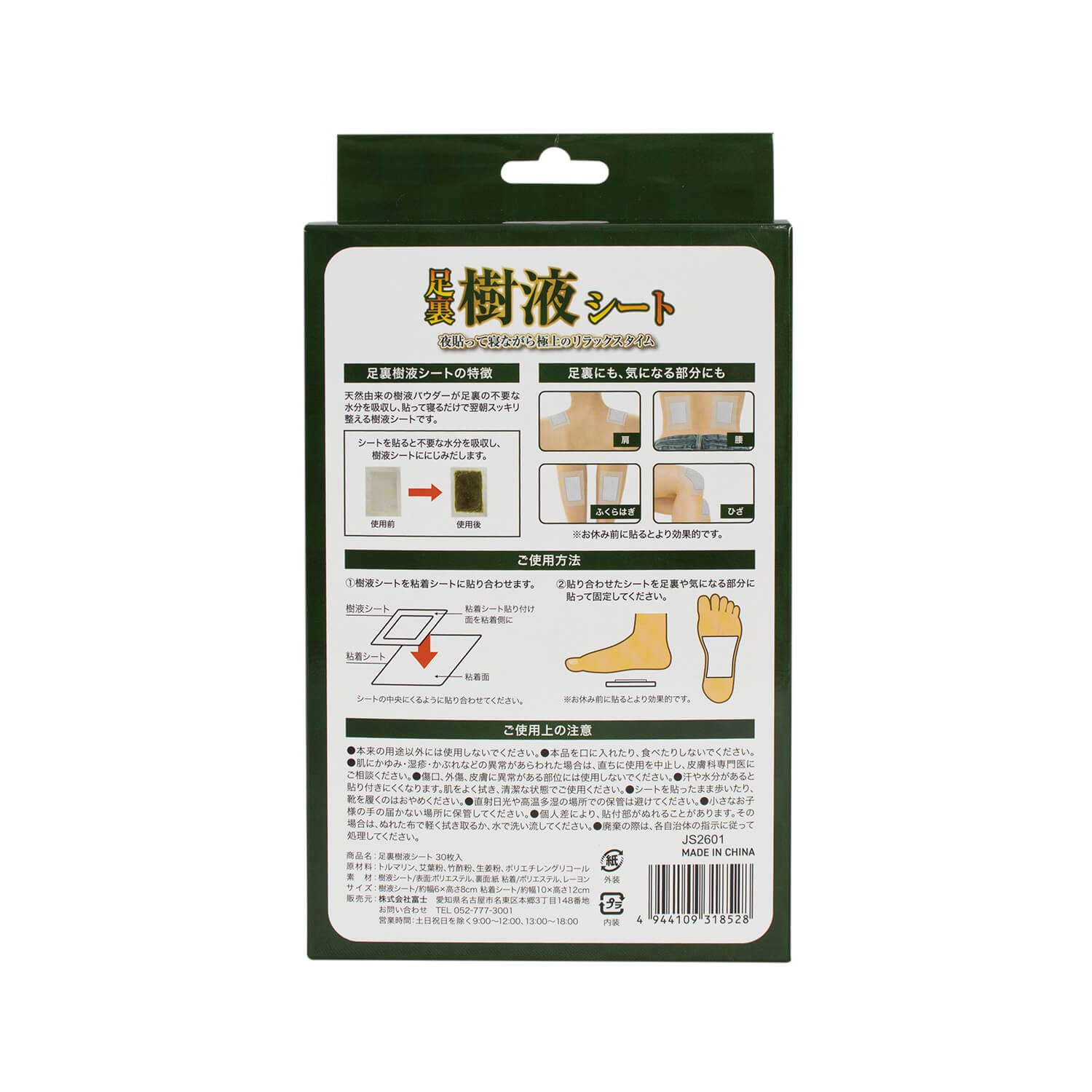 素材:原材料/トルマリン、艾葉粉、竹酢粉、生姜粉、ポリエチレングリコール 樹液シート/表面:ポリエステル裏面:紙粘着/ポリエステル、レーヨン
