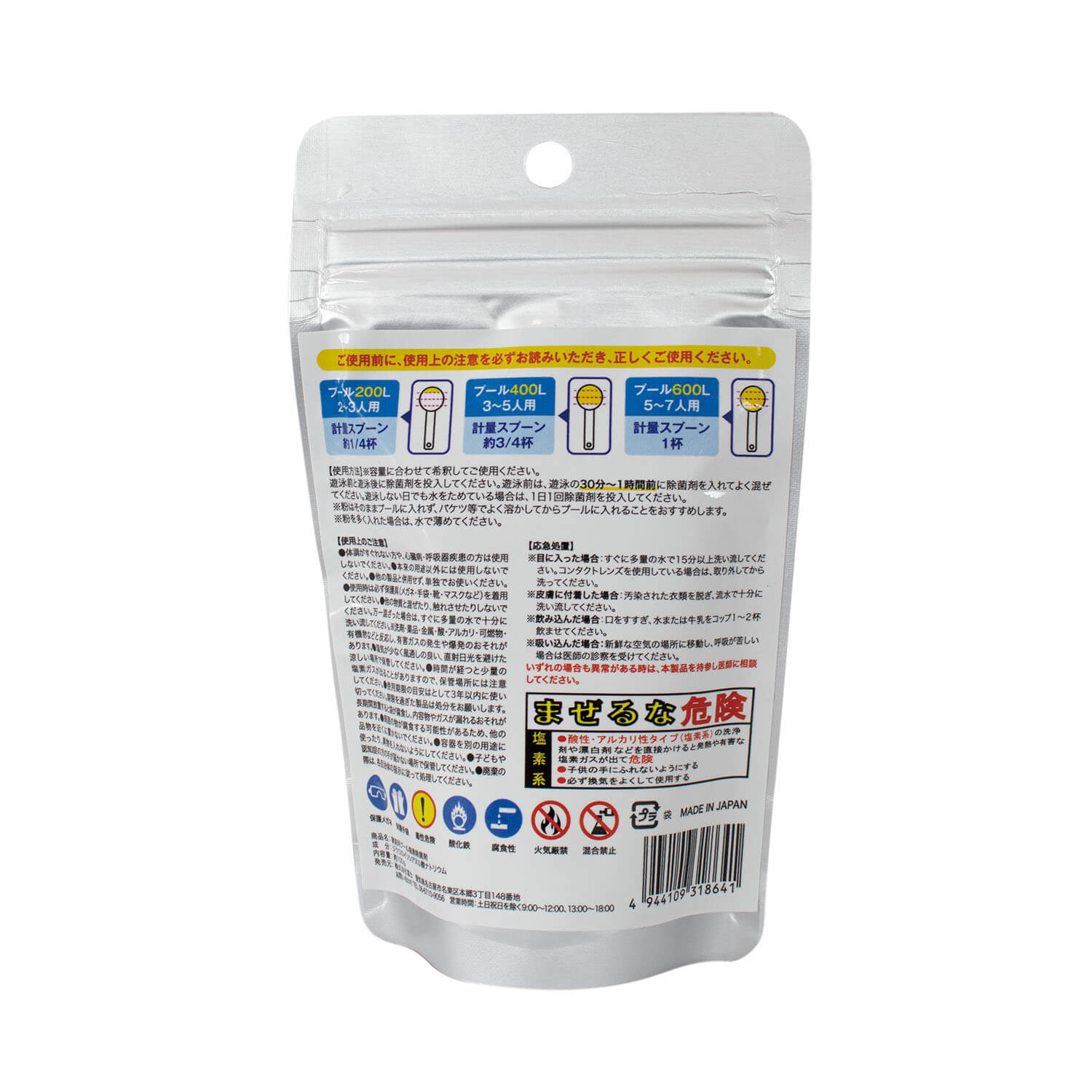 粉末タイプなので必要量を調整しやすく、小型~大型の家庭用プールに対応。